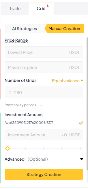 - Manual Creation: Set the spot grid parameters manually based on your judgment of the oscillating market range, including basic and advanced parameters.