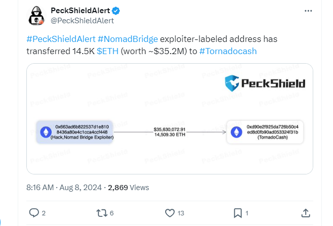 A Nomad Bridge exploiter-labeled address has transferred 14,500 Ether, worth approximately $35.2 million, to Tornado Cash, a popular cryptocurrency mixing service.